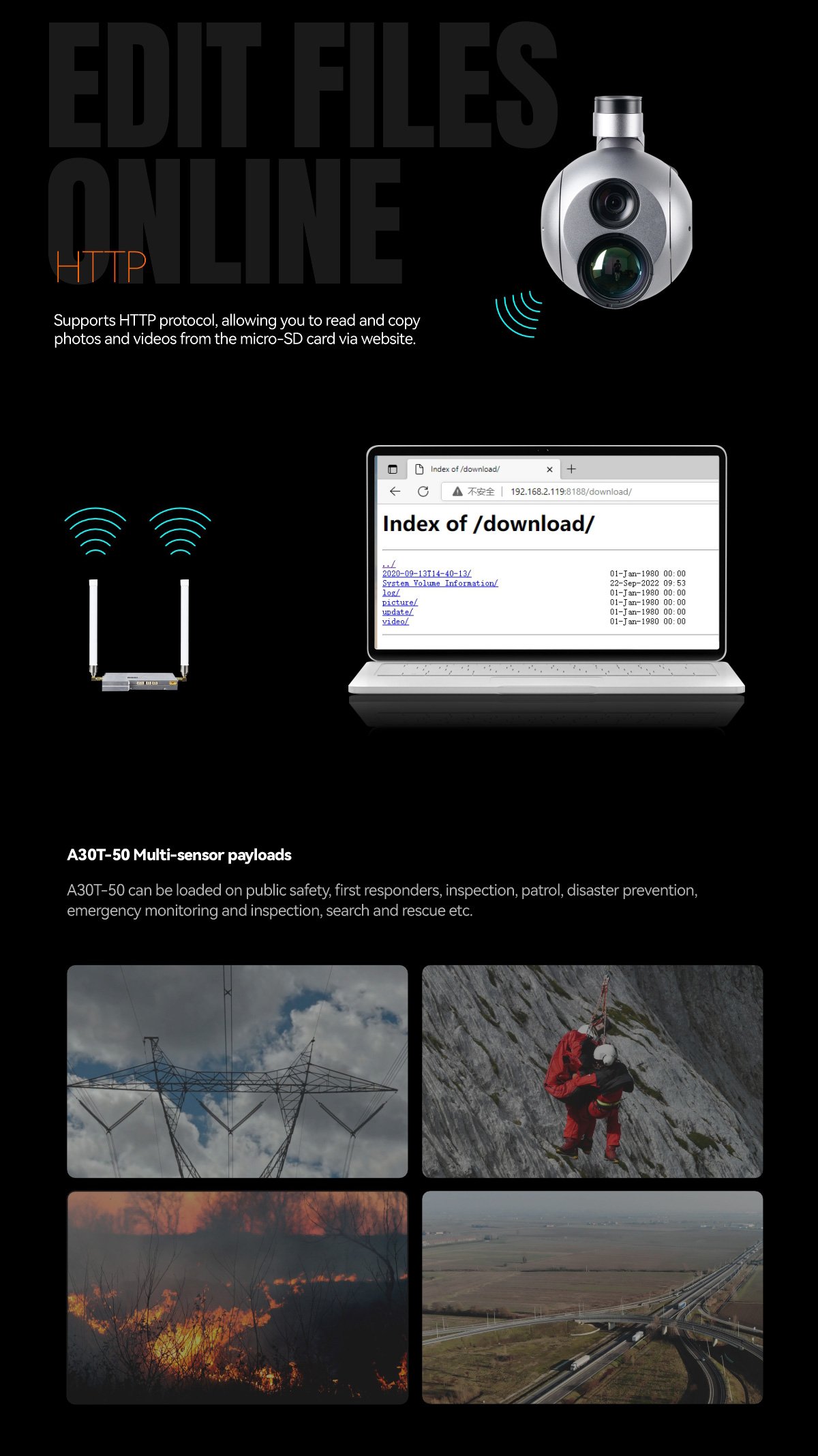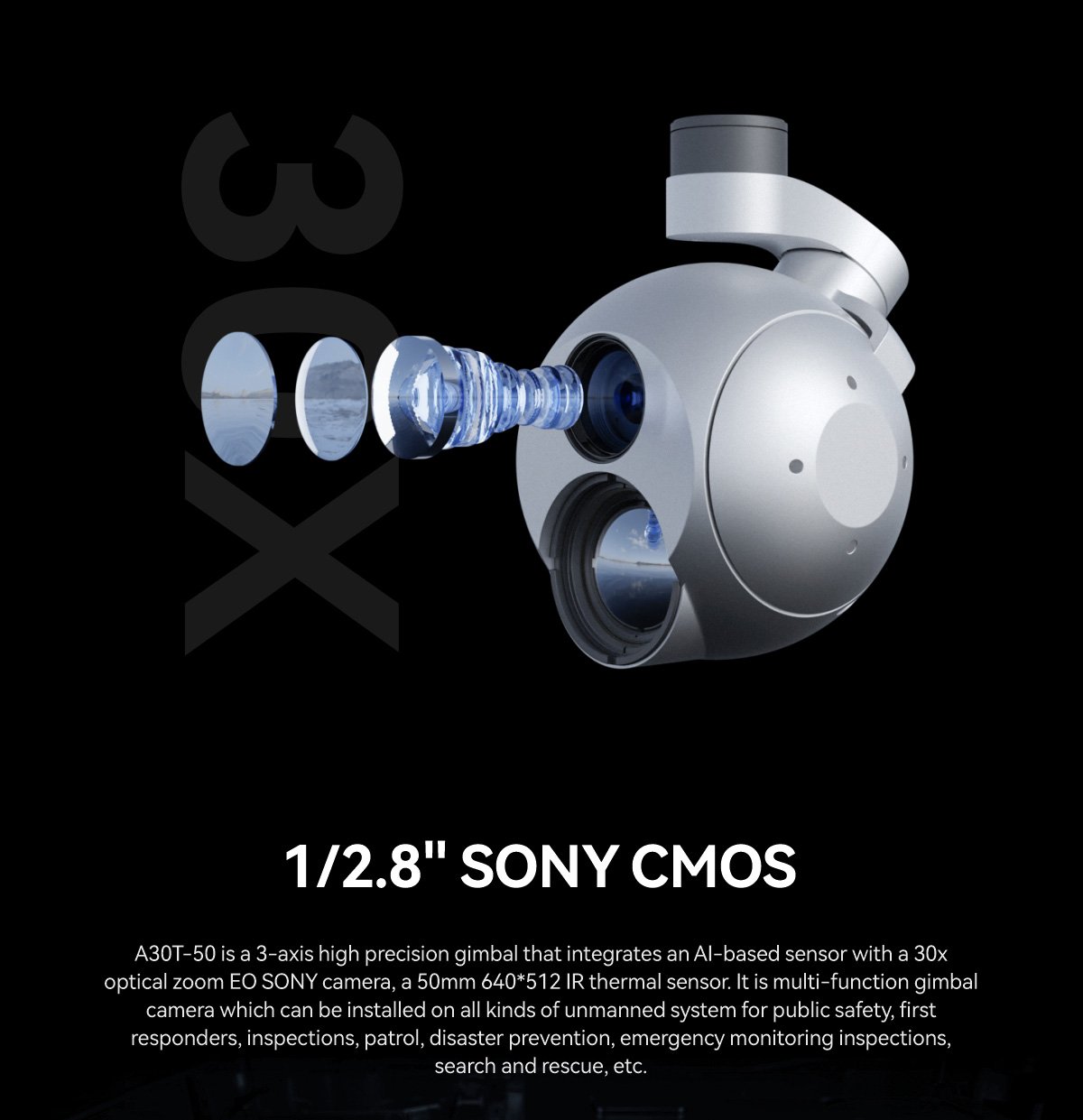 MA30T-50 is a 3-axis high-precision gimbal that integrates an AI-based sensor with a 30x optical zoom EO SONY camera, a 50mm 640*512 IR thermal sensor. It is the most powerful and multi-function payload camera. A30T-50 can be installed on all kinds of drones for public safety, first responders, inspections, patrol, disaster prevention, emergency monitoring inspections, search and rescue, etc.