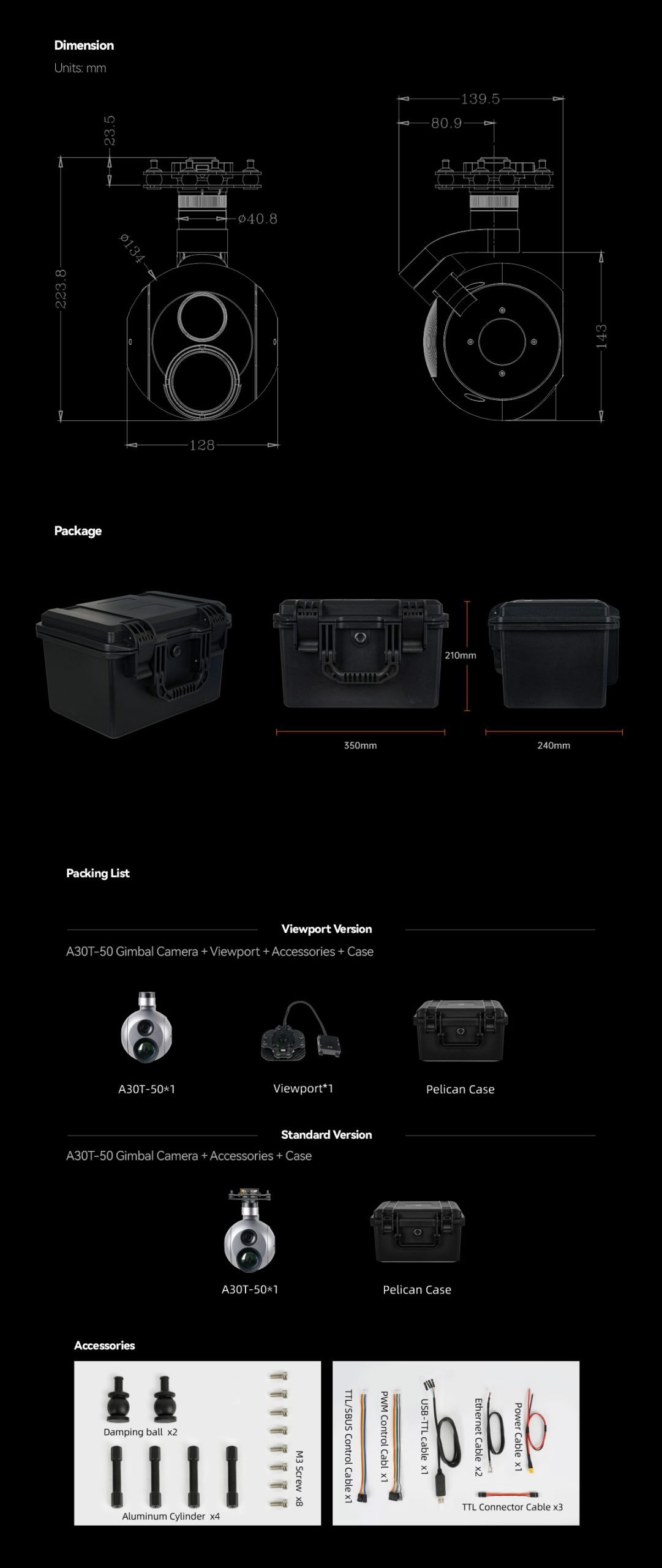 | Accessories | 1pc gimbal camera device, screws, copper cylinders, damping balls,1pc USB to TTL cable / Hight quality plastic box with foam cushion |
