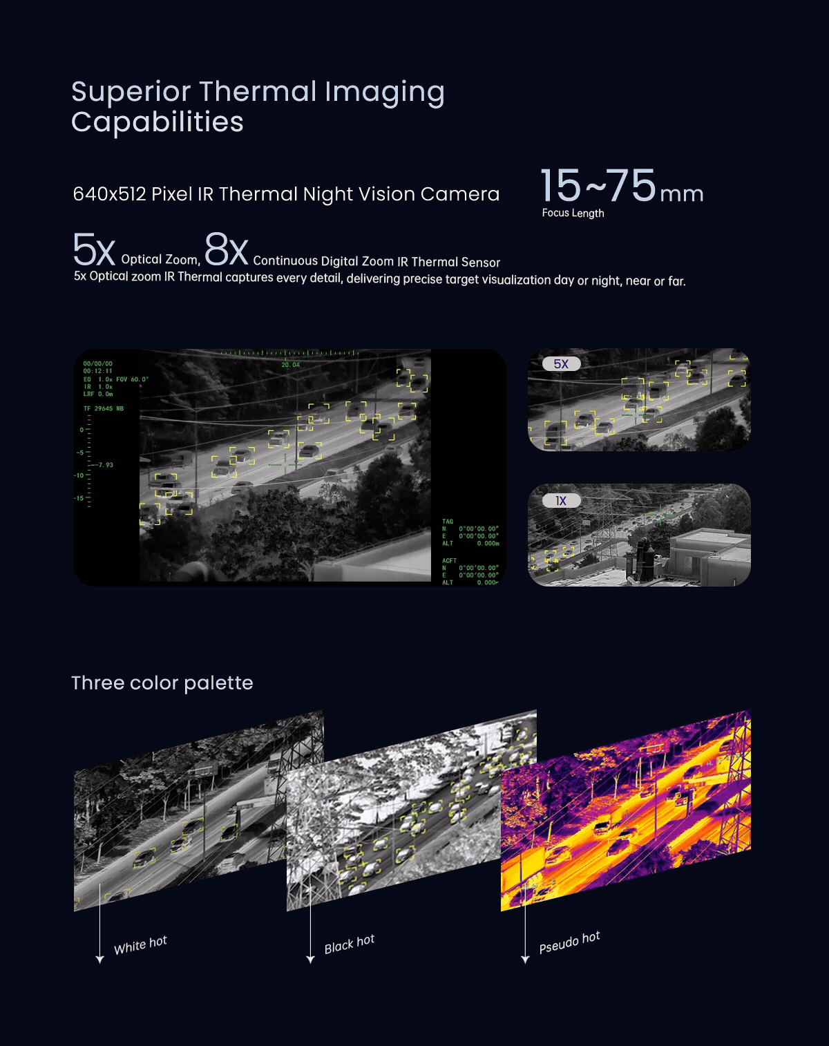 | Color palette | white hot, black hot, Iron Red |