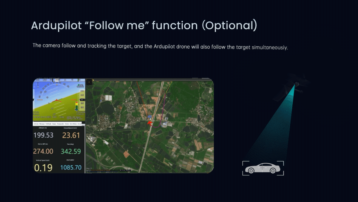 | ArduPilot / PX4 | Support(Mavlink protocol ) Optional: Support Ardupilot Follow me feature |