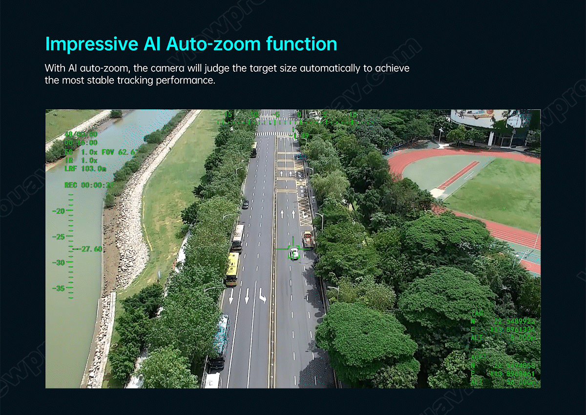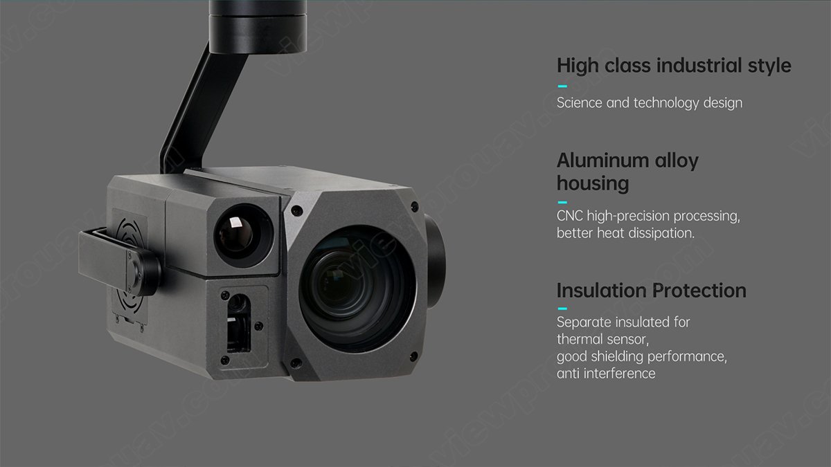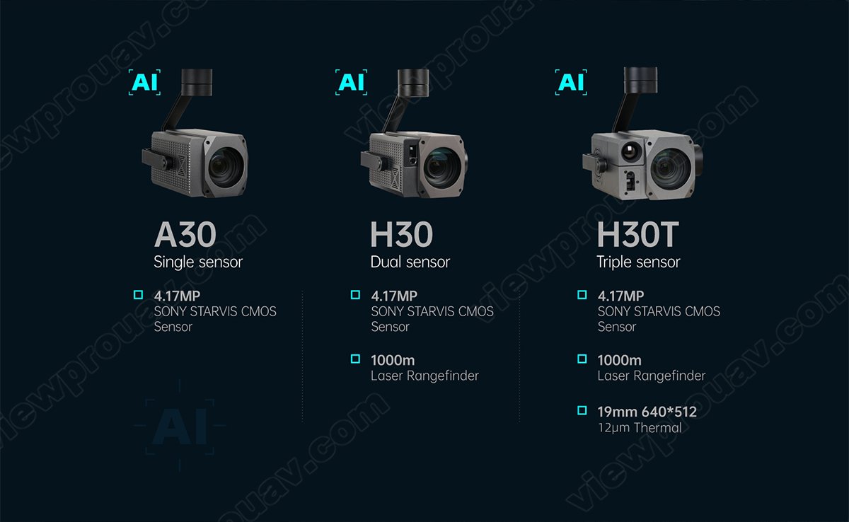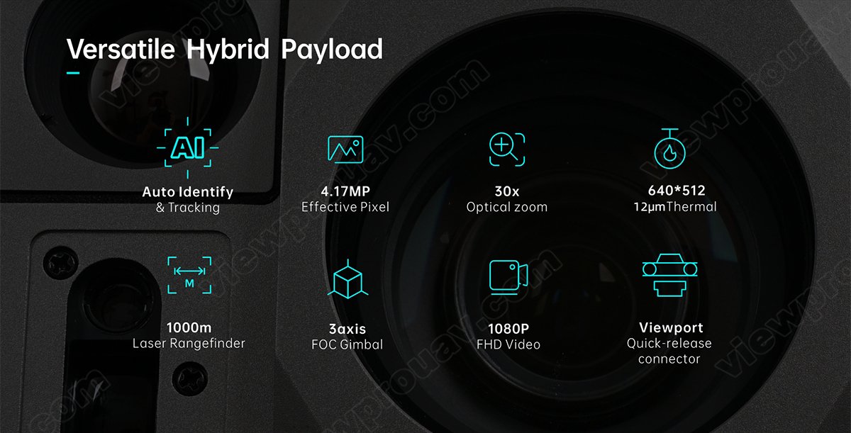 This Dark Knight Returns series H30T is amazing for the 30x SONY STARVIS CMOS sensor which is supporting starlight night vision and super image stabilization. Combined with Viewpro powerful AI algorithm, these payloads support human and car auto detection sensitively and stable AI tracking with 1000m LRF.