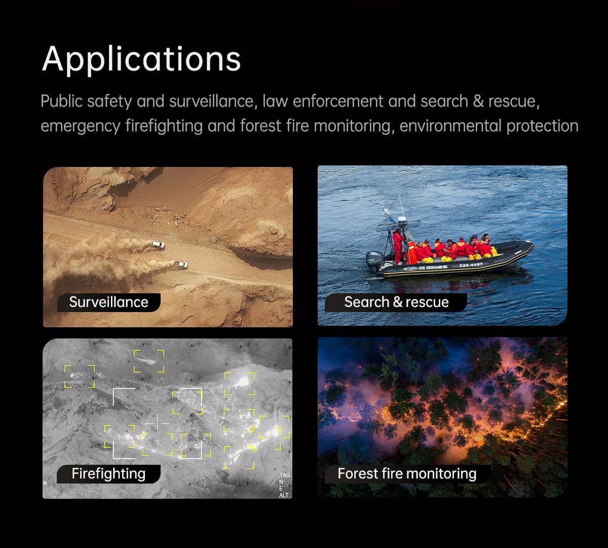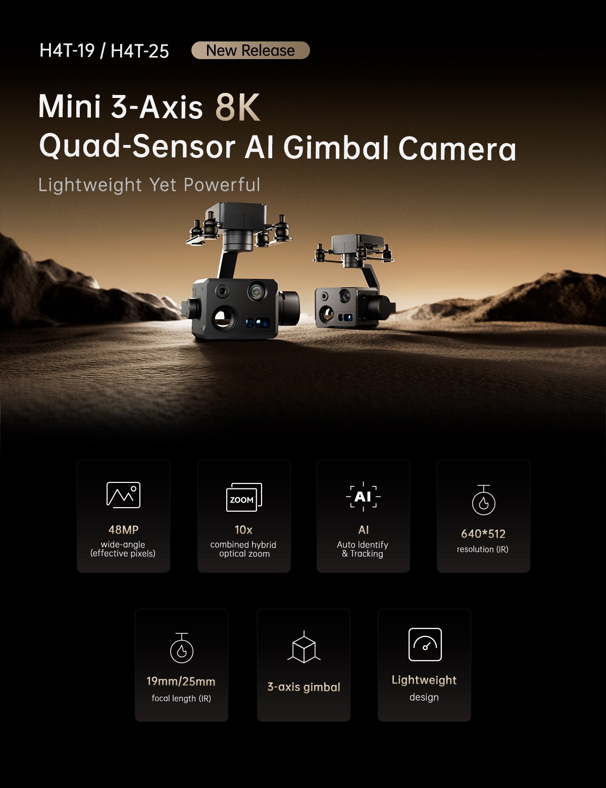 The MH4T Series integrates four major modules: 8K wide-angle camera, 8K zoom camera, infrared thermal imaging camera, and laser rangefinder. Powered by AI algorithms, it greatly enhances operational efficiency across industries such as energy inspection, emergency firefighting, water conservation and forestry.
