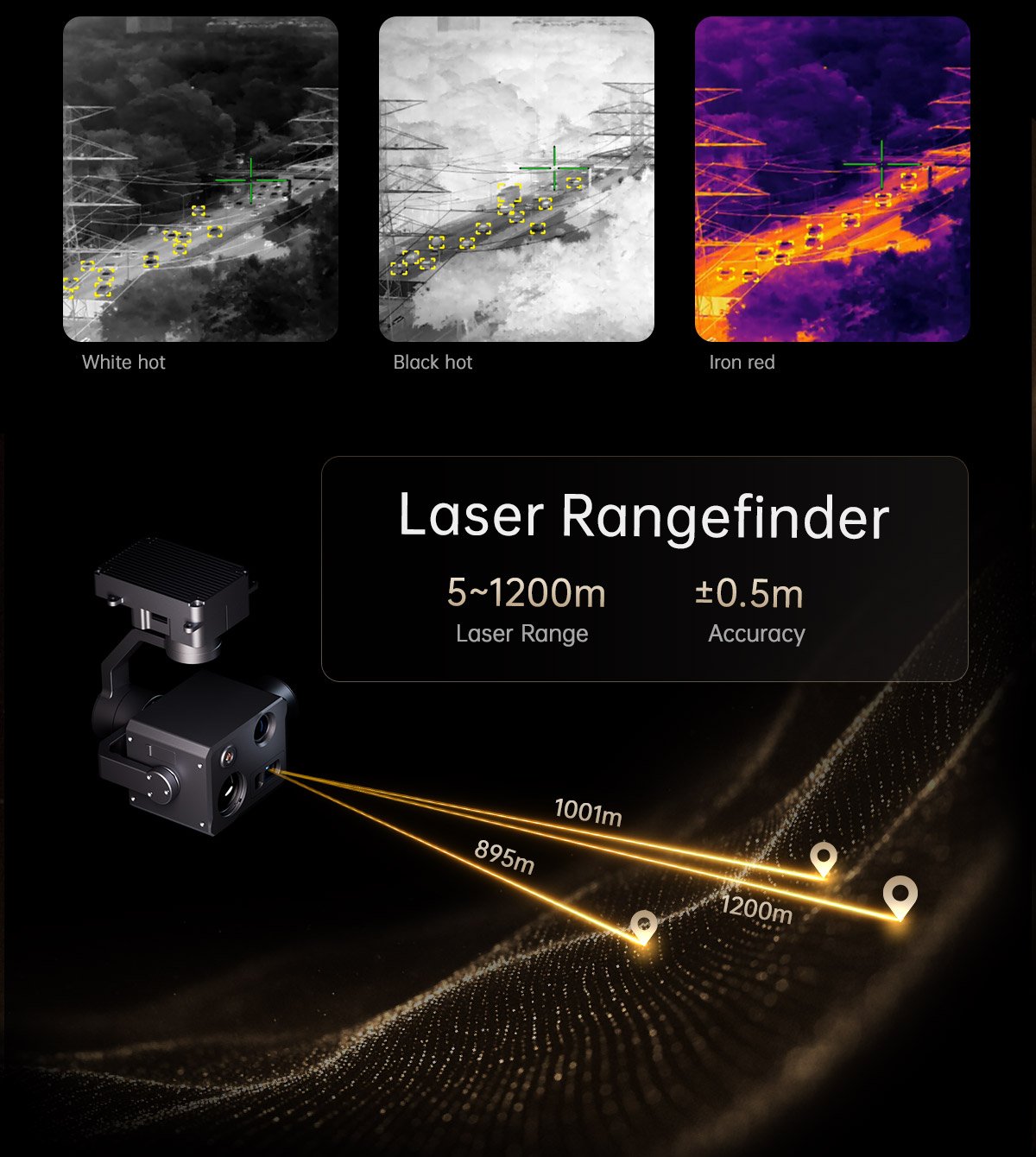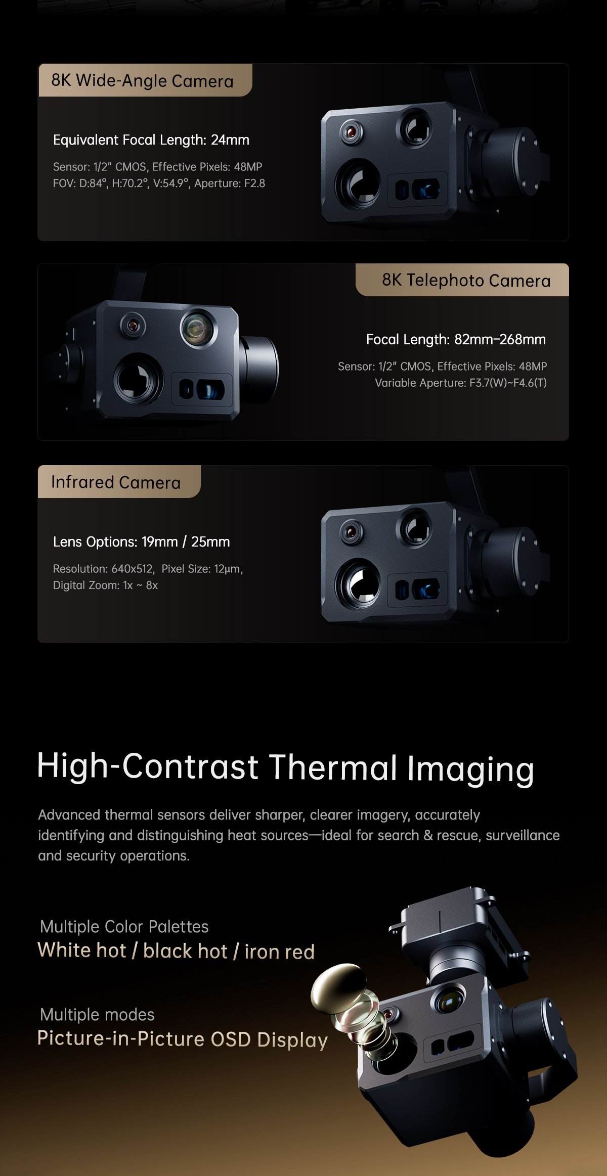 | Picture in TF Card | TF card 1 (top slot): EO 1920*1080, IR 640*512 TF card 2 (camera slot): wide-angle camera 4000*3000, zoom camera 4000*3000 |