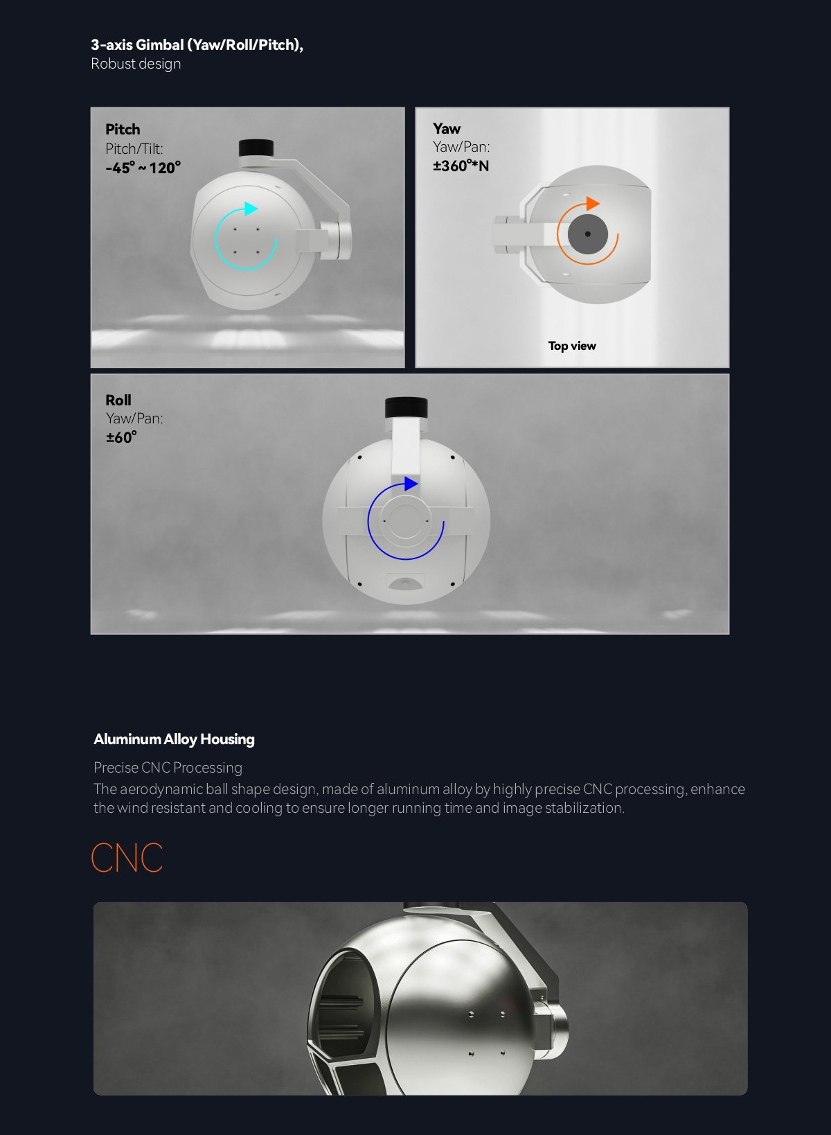 | Mechanical Range | Pitch/Tilt:-55 105 , Roll: 60 , Yaw/Pan: 360 *N |