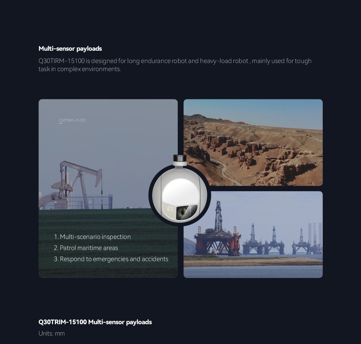 The MQ30TIRM-15100 is a professional-grade gimbal camera system featuring triple integrated sensors for comprehensive surveillance capabilities. It combines a 4.17MP STARVIS EO camera with 30x optical zoom and 12x digital zoom, a 1280×1024 uncooled thermal imager with exceptional long-range detection up to 12.7km, and an integrated laser rangefinder accurate to 2 meters. The gimbal offers precise stabilization with 0.02-degree vibration control and 360-degree pan capability. Advanced features include real-time object tracking, dual video output modes, GPS geotagging, and support for ArduPilot and PX4 autopilot systems. Operating in extreme temperatures from -20 to +50 degrees Celsius, it delivers exceptional low-light performance with 0.009 lux minimum illumination. Multiple control interfaces including PWM, TTL, S.BUS, TCP, and UDP ensure seamless integration with various platforms. Perfect for surveillance, reconnaissance, search and rescue, and industrial inspection applications.