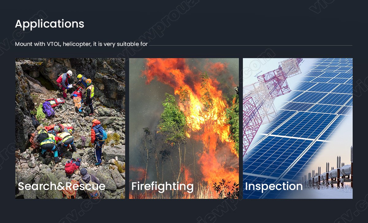 MQ40TIR is a powerful 3-axis gimbal camera which integrates a 20x optical zoom/40x IA zoom camera, a 50mm 640 480 thermal camera. The 3-axis gimbal based on FOC technology features high stability, accuracy and sensitivity. The image is very stable even at 40 times zoom. Detecting by heat source, the 50mm thermal camera can reveal the damage of buildings, fire spark in forest, the location of people or animal and more. It very suitable for VTOL, Helicopter, etc, mainly supply in fire-fighting, surveillance, inspection, search and rescue etc.
