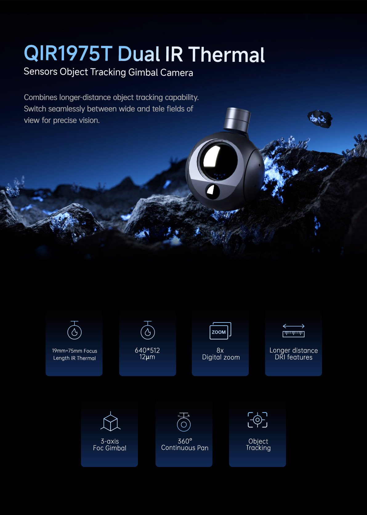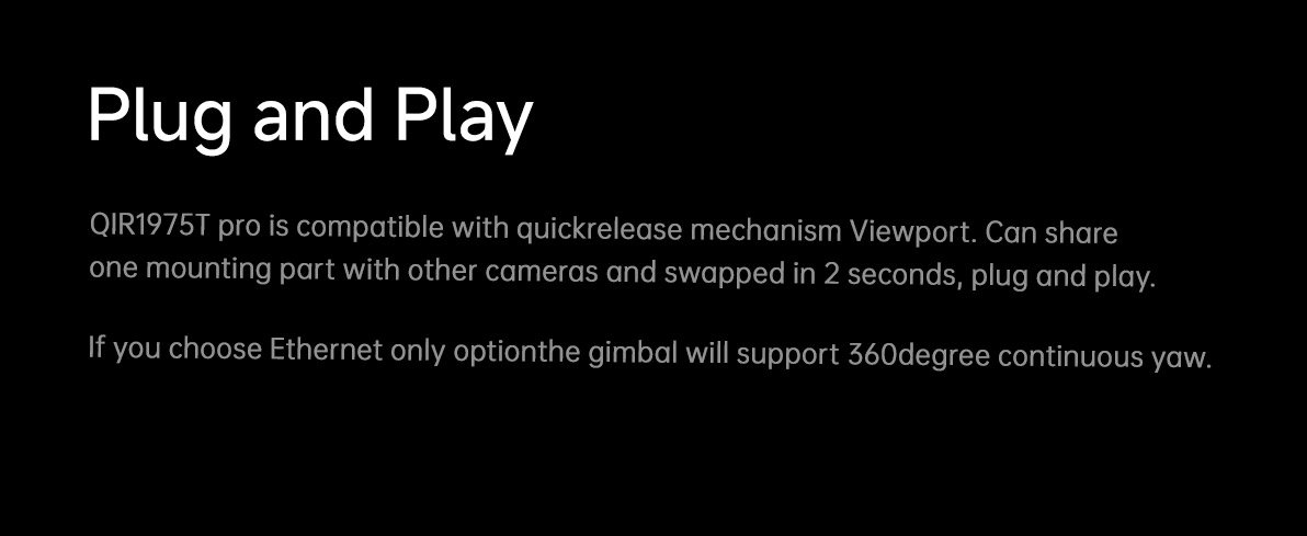 MQIR1875T is a 3-axis dual IR thermal imager sensors (18mm and 75mm focus length ) gimbal camera, which combines longer-distance object tracking capability. Switch seamlessly between narrow and vast fields of view for precise vision.