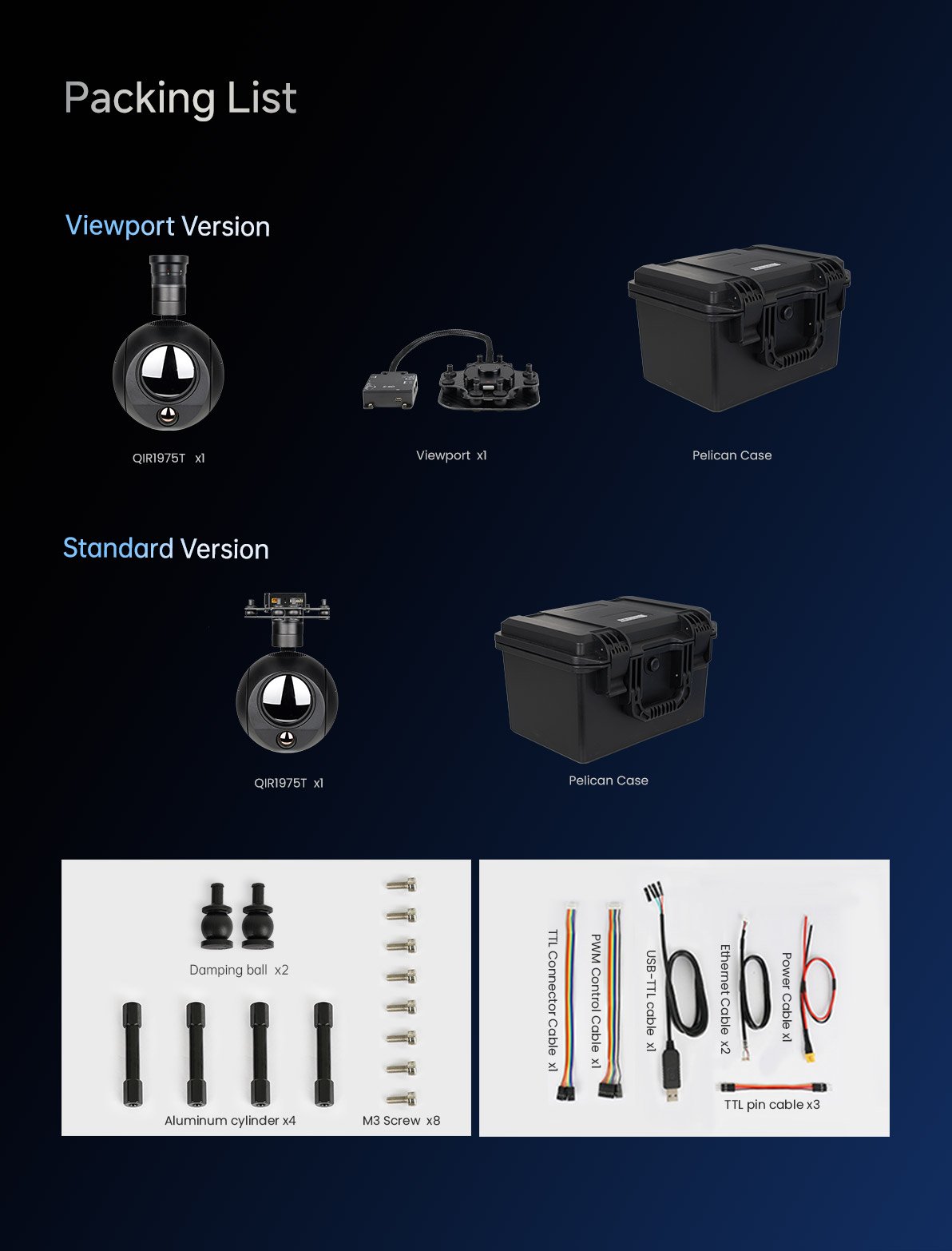 | Accessories | 1pc gimbal camera device, screws, aluminum cylinders, damping balls,1pc USB to TTL cable / Hight quality plastic box with foam cushion |