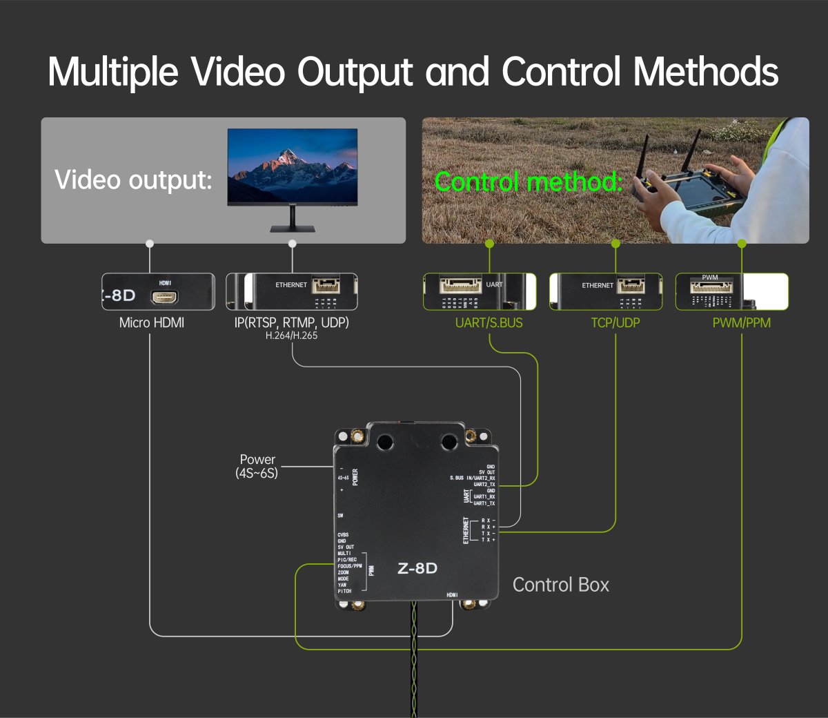 | Control method | PWM / TTL / S.BUS / TCP(IP output)/UDP(IP output version) |