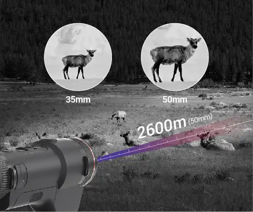 Multiple focal lengths give TJ LRF Pro Series convenience for long-distance observation and hunting, the maximum 50mm F1.0 lens can detect targets up to 2600m.