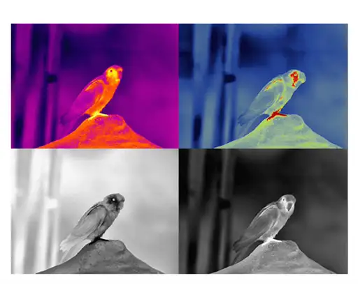 Six color palettes: white hot, black hot, red hot, green hot, iron red, blue heat.