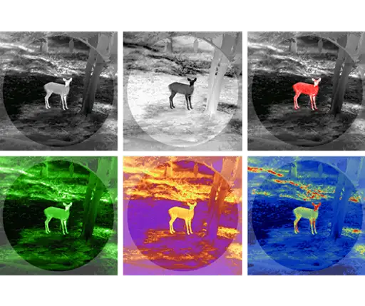 Six color palettes: white hot, black hot, red hot, green hot, iron red, blue heat.