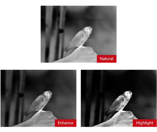 Enhance/Highlight/Natural can be quickly switched by one button, the image can be adaptively adjusted for different scenes , Enhance/Highlight can effectively reduce image impurities to highlight the target.