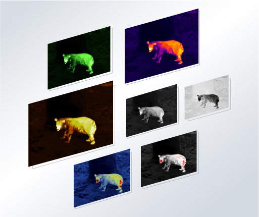 The 7 color palettes improve viewing under various conditions. White Hot, Black Hot, and Red Hot are optimal for object detection. Green Hot, Iron Red, Blue Hot and Sepia help increase chances for recognition and identification.