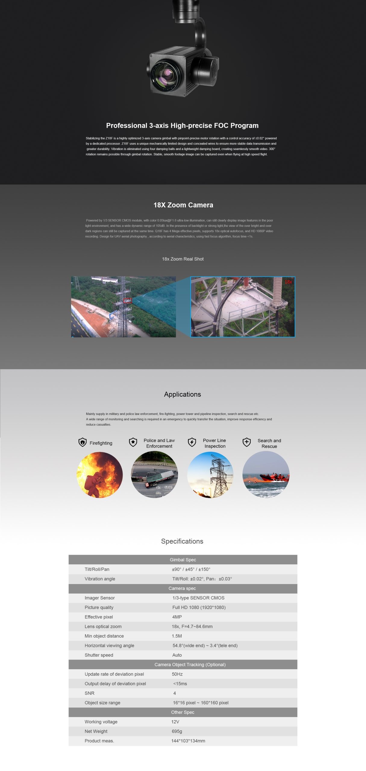 The MZ18F 18x Optical Zoom Gimbal Camera delivers professional-grade imaging with exceptional versatility. Featuring powerful 18x optical zoom capability, this advanced gimbal camera captures stunning detail from impressive distances without quality loss. The integrated gimbal system ensures smooth, stabilized footage for professional video production, aerial photography, and surveillance applications. With its precision optical zoom lens and robust stabilization technology, the MZ18F is ideal for demanding users who require reliable performance and superior image quality in any shooting scenario.